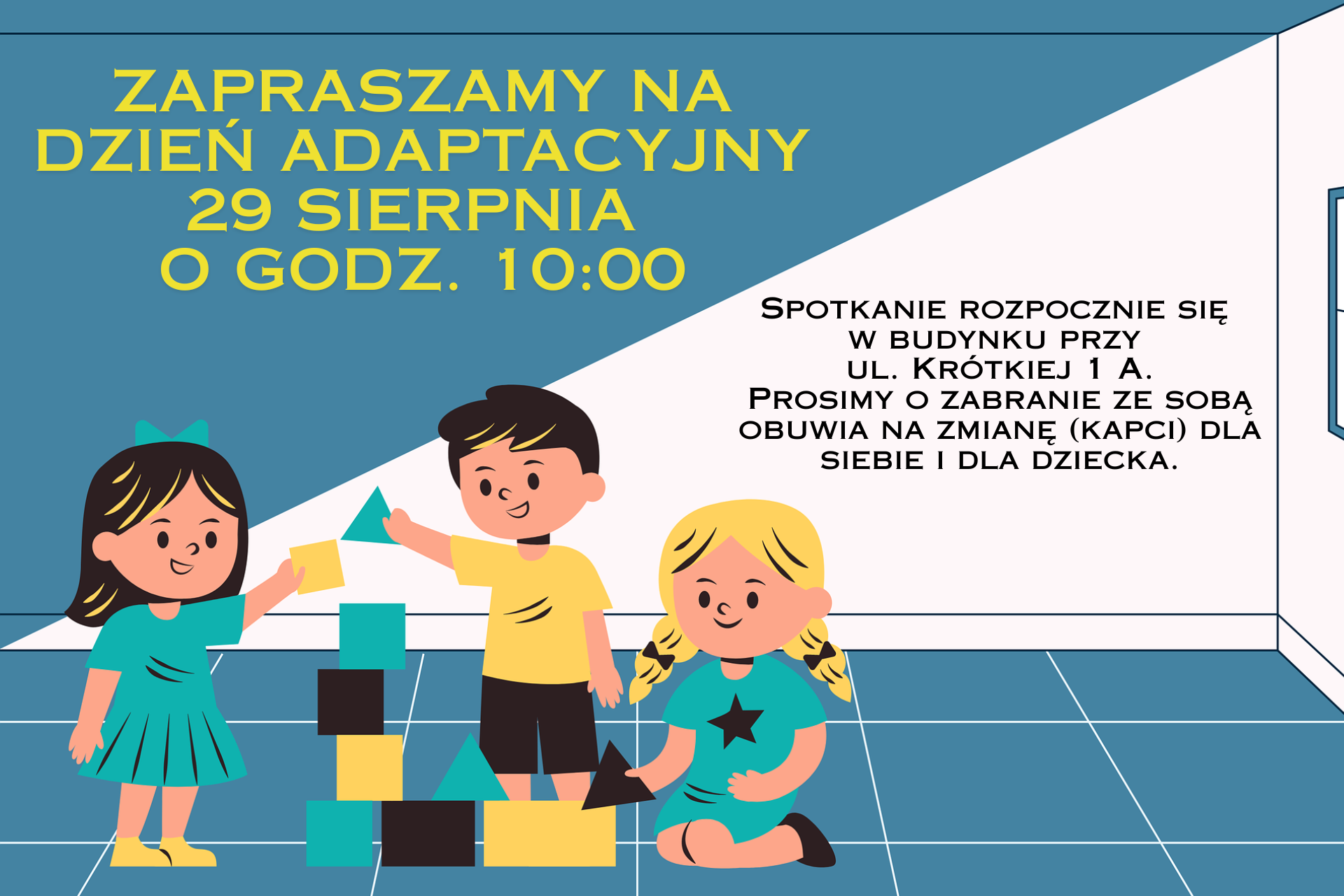 Serdecznie zapraszamy dzieci nowoprzyjęte wraz z Rodzicami na Dzień Adaptacyjny dnia 29 sierpnia w godz. 10:00 -12:00. Spotkanie rozpocznie się w budynku przy ul. Krótkiej 1 A.