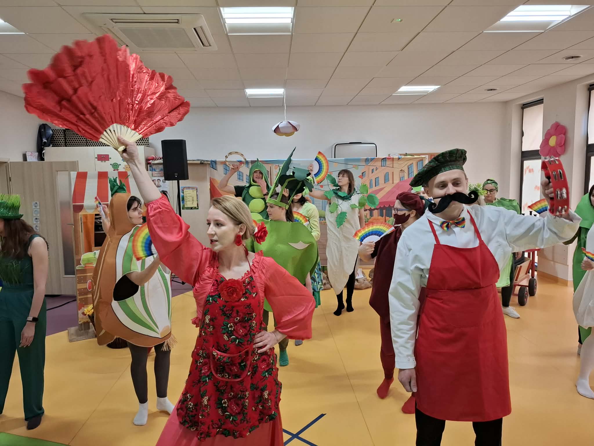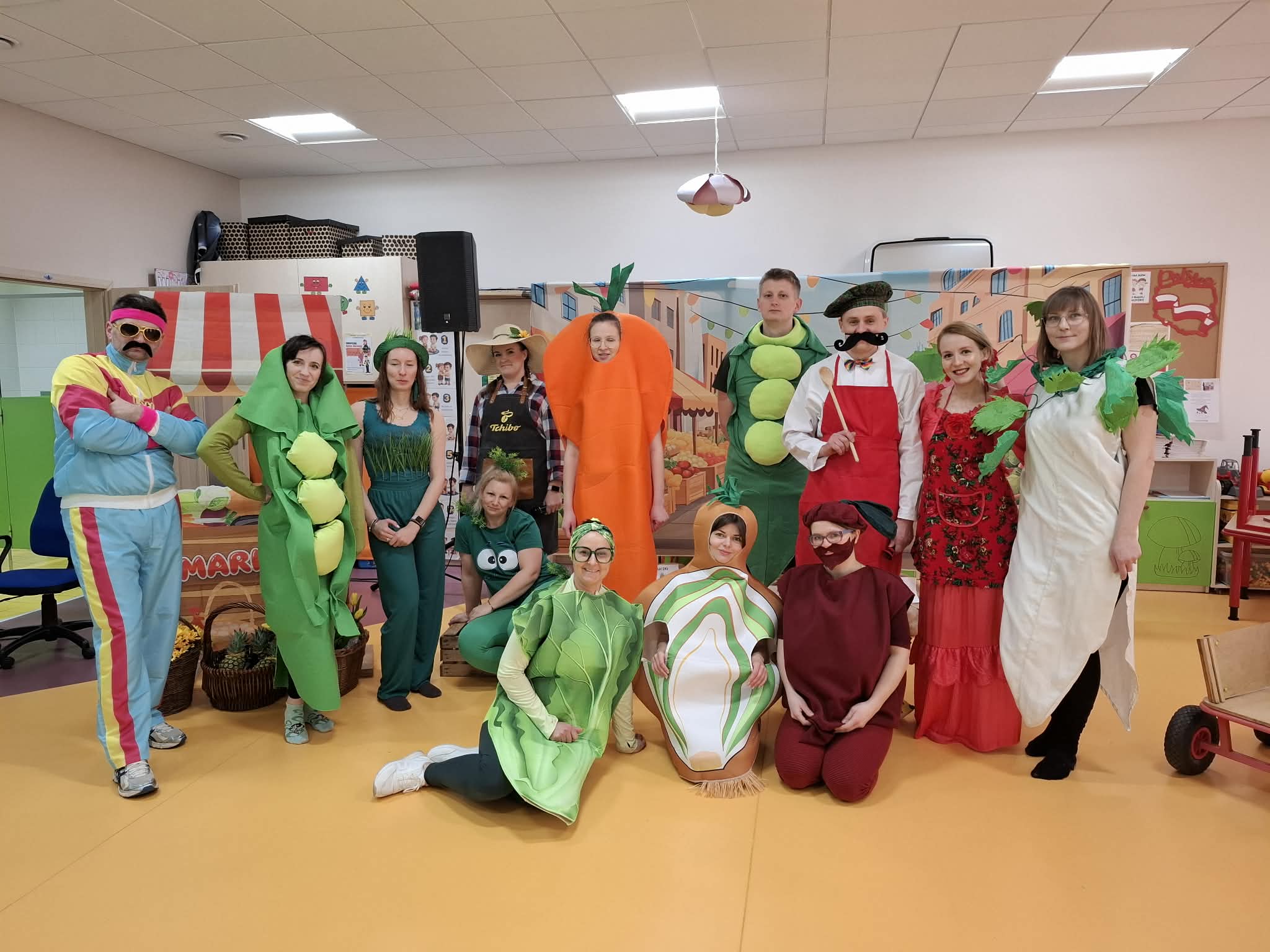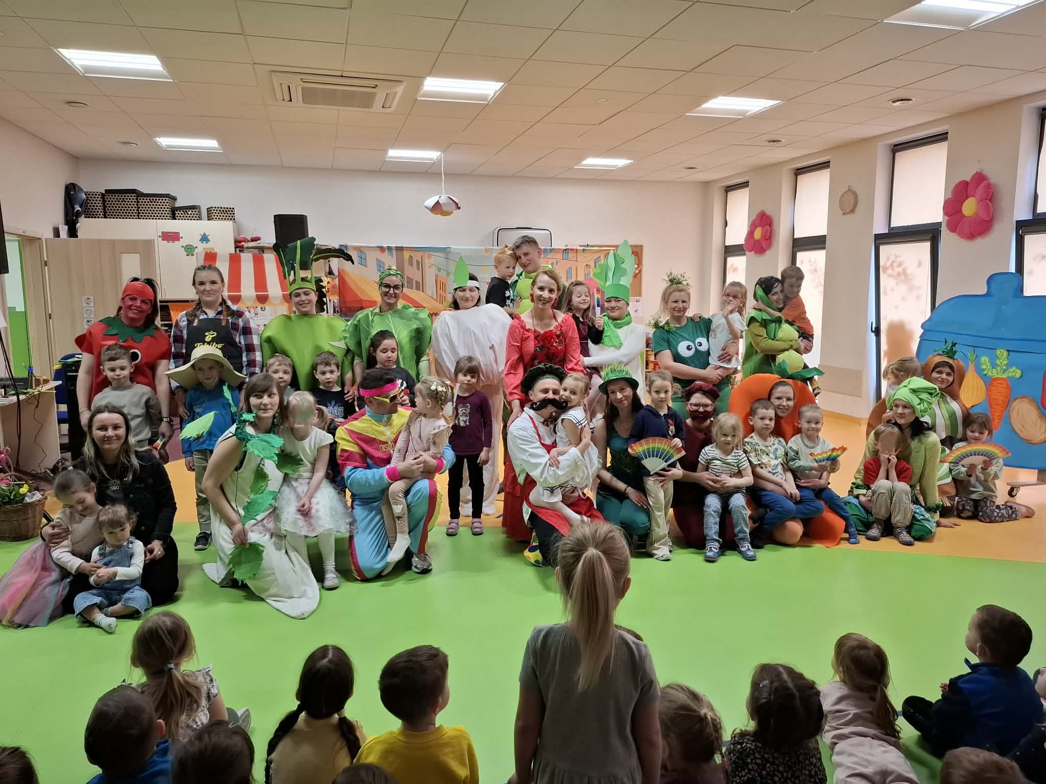 W piątek 27 marca w naszym przedszkolu obchodziliśmy Międzynarodowy Dzień Teatru. Był to dzień kiedy rodzice zamienili się w aktorów, sala przedszkolna w scenę, a przedszkolaki i kadra nauczycielska w publiczność. To wielkie wspólne przedsięwzięcie miało na celu pokazanie jak ważna jest sztuka w naszym życiu i że każdy z nas może ją tworzyć. Wspólnie z rodzicami przygotowaliśmy przedstawienie, które miało na celu promowanie zdrowej żywności. Rodzice w roli warzyw w sposób kolorowy, humorystyczny i emocjonalny przedstawili sztukę Jana Brzechwy pt. „Na straganie ". A jak warzywa, to nie mogło zabraknąć również kucharza Romana i jego kucharki hiszpanki. I tak oto powstał przepis na zupę, w której znalazł się taniec i oczywiście muzyka przy udziale Naszego Wielkiego Muzyka Tomka. Wszystko po to, aby zobaczyć błysk w oku dzieci z powodu dumy rodzica, radość z widowiska. Przedszkolaki z zapartym tchem obserwowały teatrzyk, który przypadł im do gustu. Po zakończeniu przedstawienia wszyscy aktorzy otrzymali gromkie brawa. Bardzo dziękujemy rodzicom i pani Oldze za czas poświęcony czas na przygotowanie przedstawienia oraz za zaangażowanie.