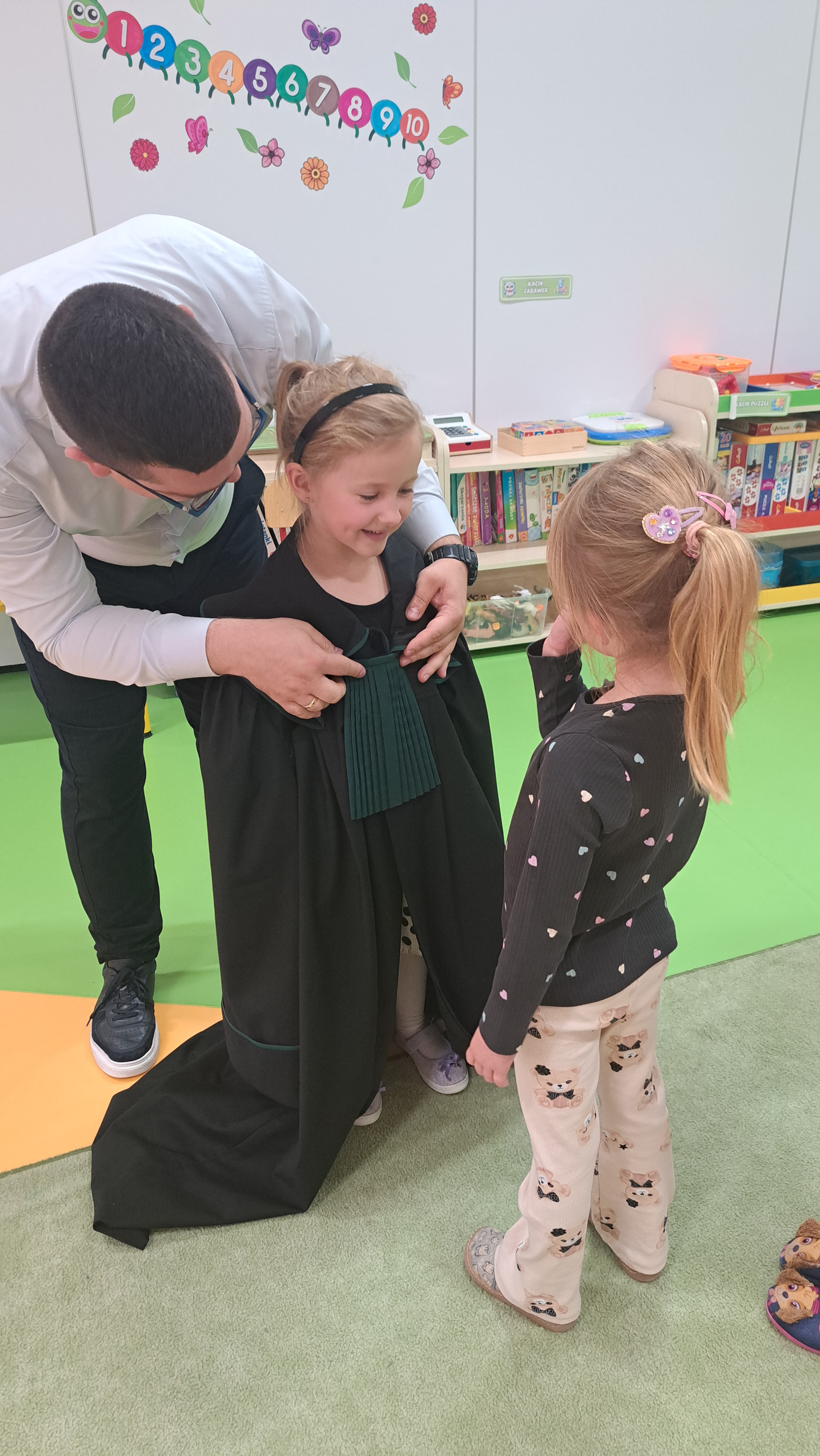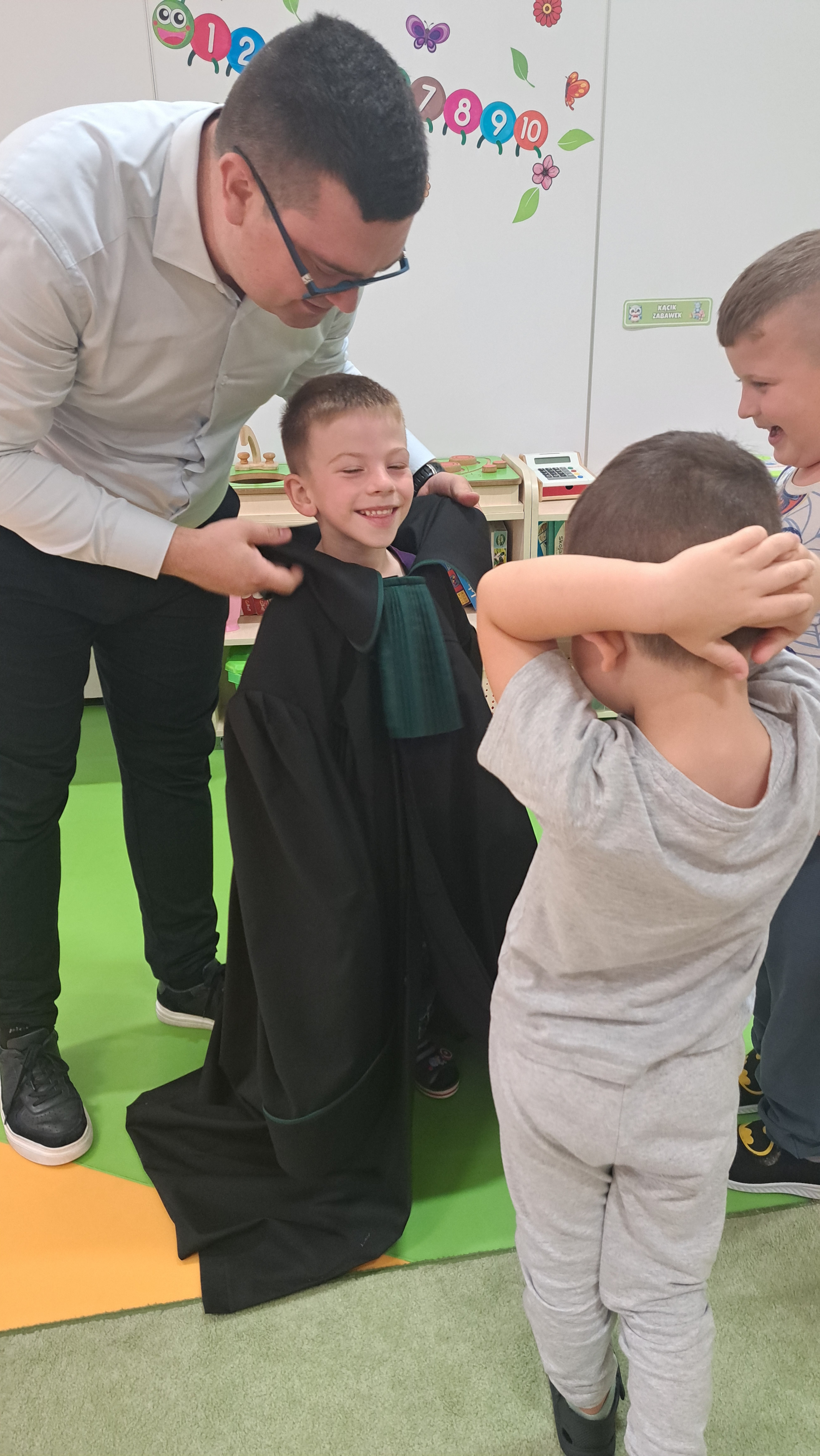 Podczas wizyty dzieci wysłuchały bajek z książki pt. „Leśne sprawy aplikantów adwokackich" : "Krecia robota pod lipą" i "Sprawy kozy Kamili”. Na zakończenie przedszkolaki miały możliwość przymierzenia togi adwokackiej. Dziękujemy serdecznie Panu Bartoszowi za odwiedziny i interesujące spotkanie.