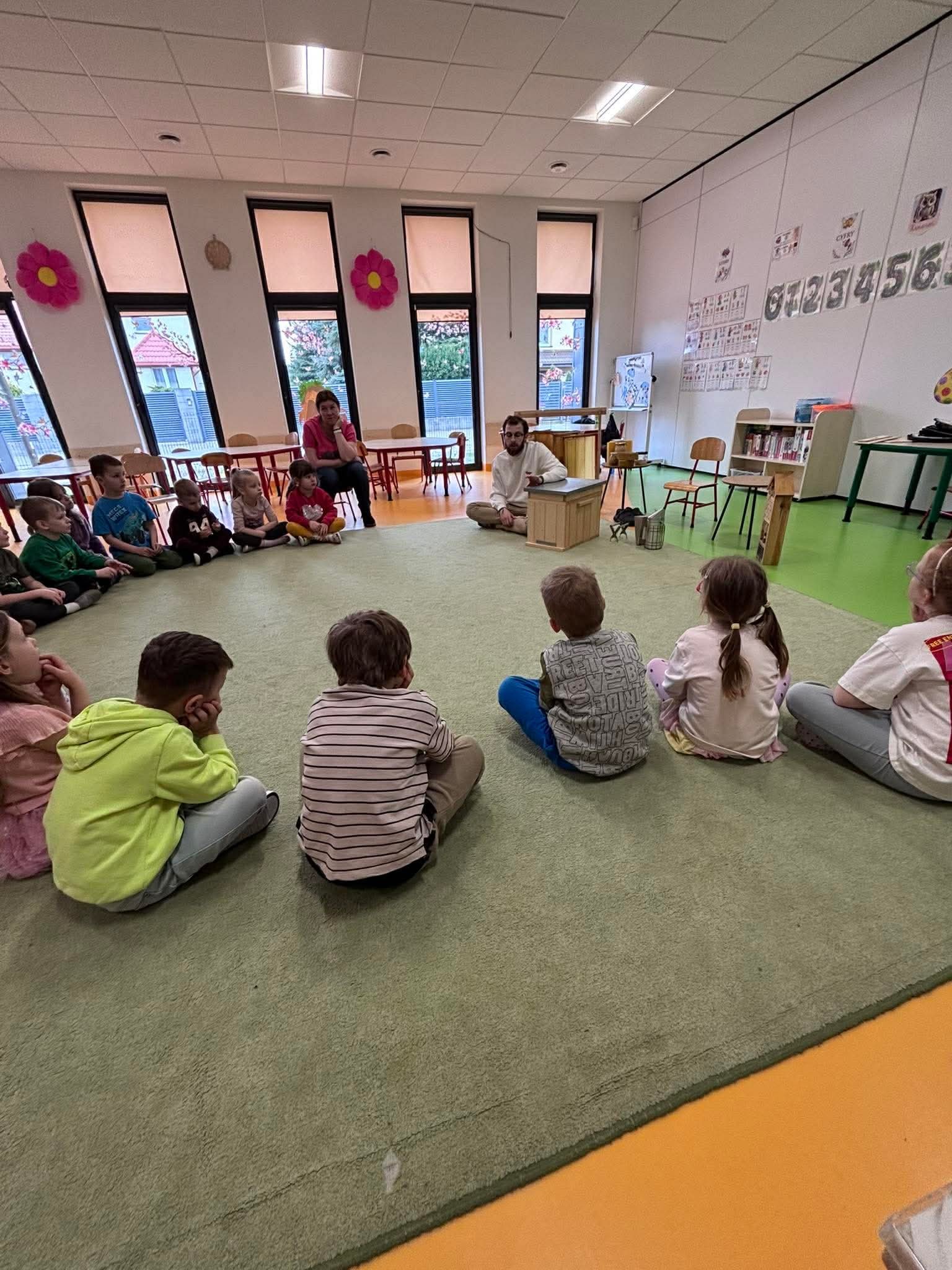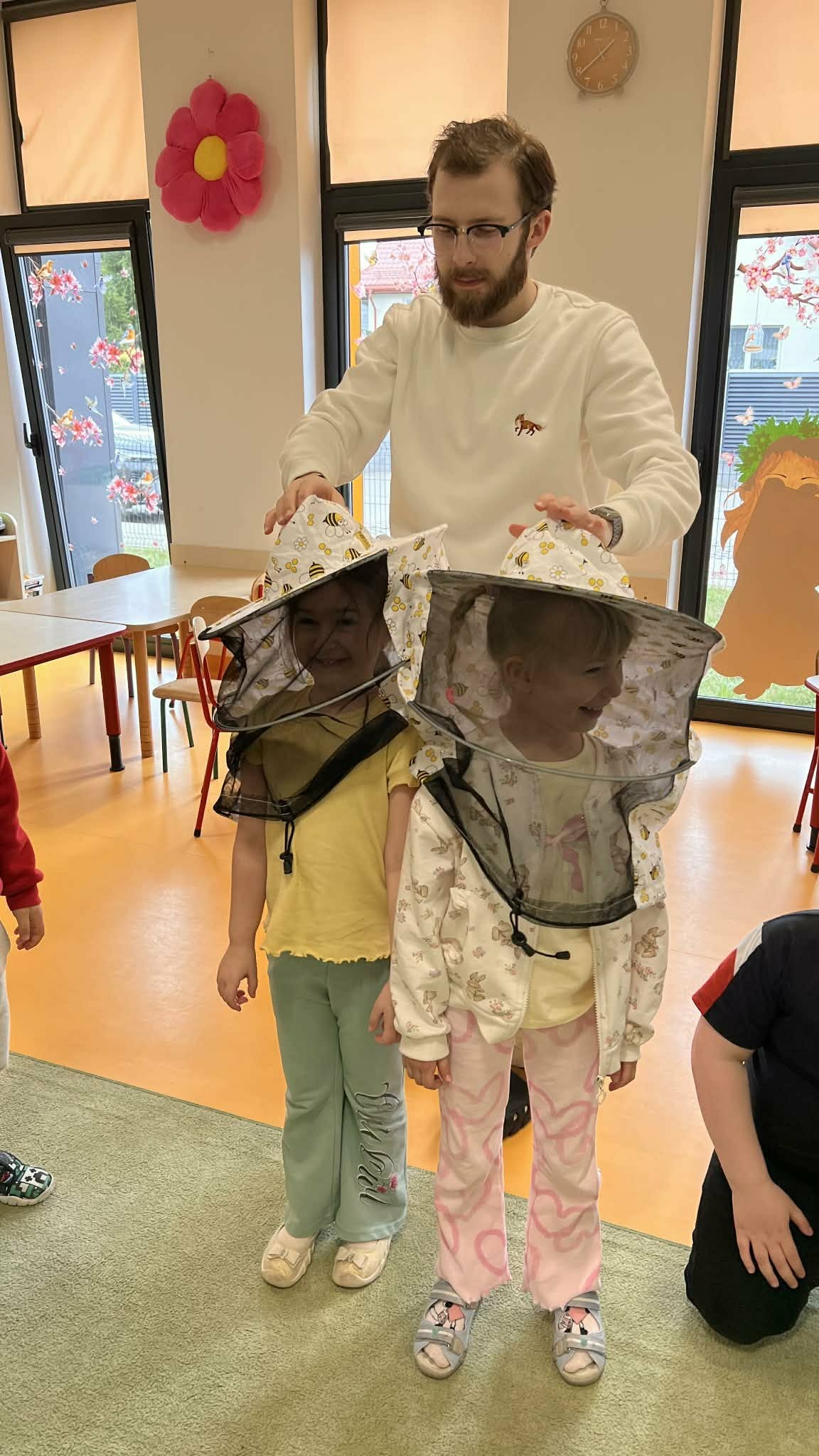 W dniu 14 kwietnia nasi wychowankowie mieli okazję uczestniczyć w niezwykłym wydarzeniu — odwiedził je pszczelarz, który podzielił się swoją wiedzą i miłością do pszczół. Przedszkolaki miały możliwość poznania tajników związanych z życiem pszczół oraz produkcją miodu. Dzięki opowieściom pszczelarza dzieci zdobyły wiele cennych informacji i ciekawostek z życia pszczół. W trakcie opowiadania poznały fascynujący świat tych owadów. Dowiedziały się dlaczego pszczoły tańczą, ile kwiatów muszą odwiedzić aby zebrać kropelkę miodu, czym się żywią, jak spędzają zimę i jak powstaje miód. Miały możliwość zobaczyć strój pszczelarza oraz obejrzeć przybory, których używa w swojej codziennej pracy. Najważniejszym jednak przesłaniem spotkania było uświadomienie najmłodszym, jak ważne jest istnienie pszczół dla ludzi. To było pełne radości i wiedzy spotkanie, które na długo zostanie w naszej pamięci!