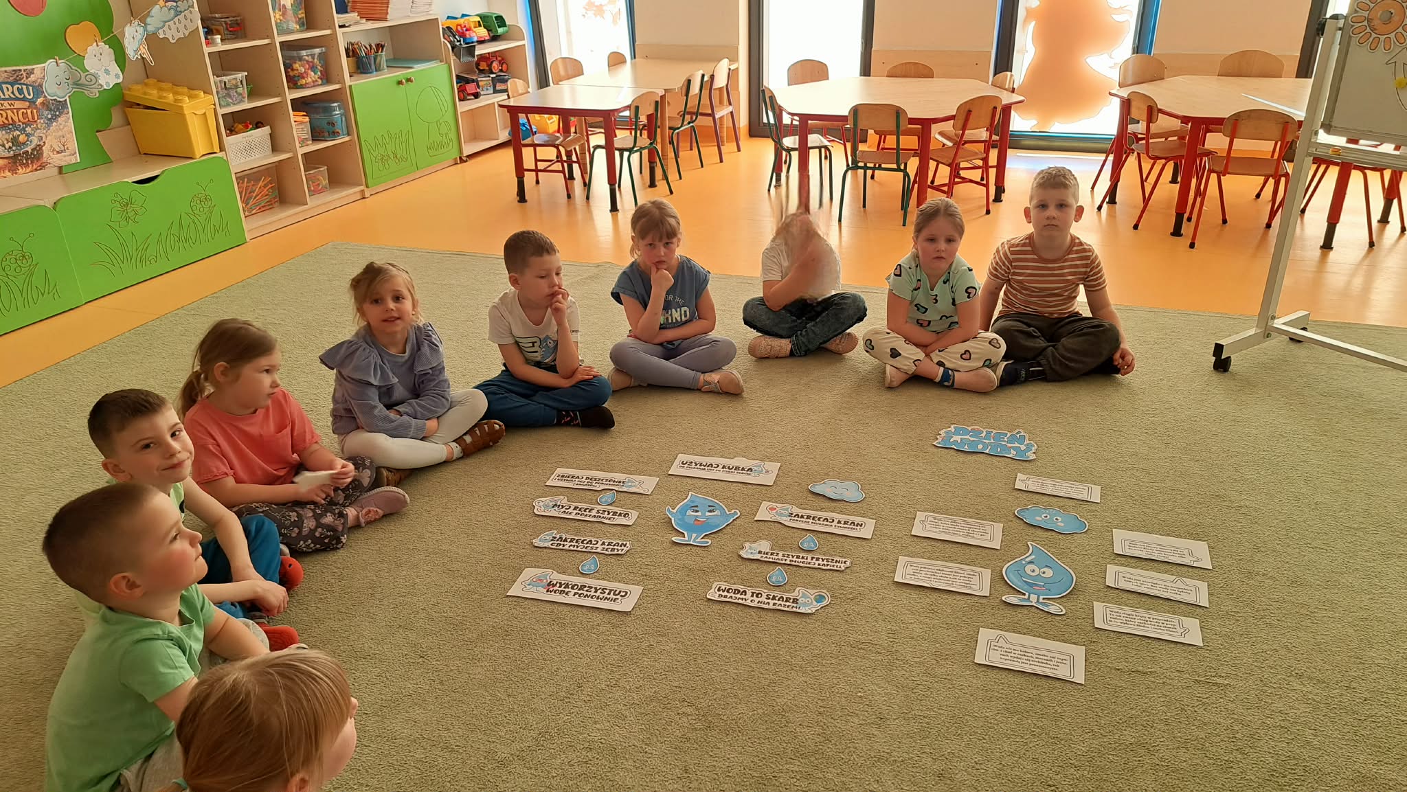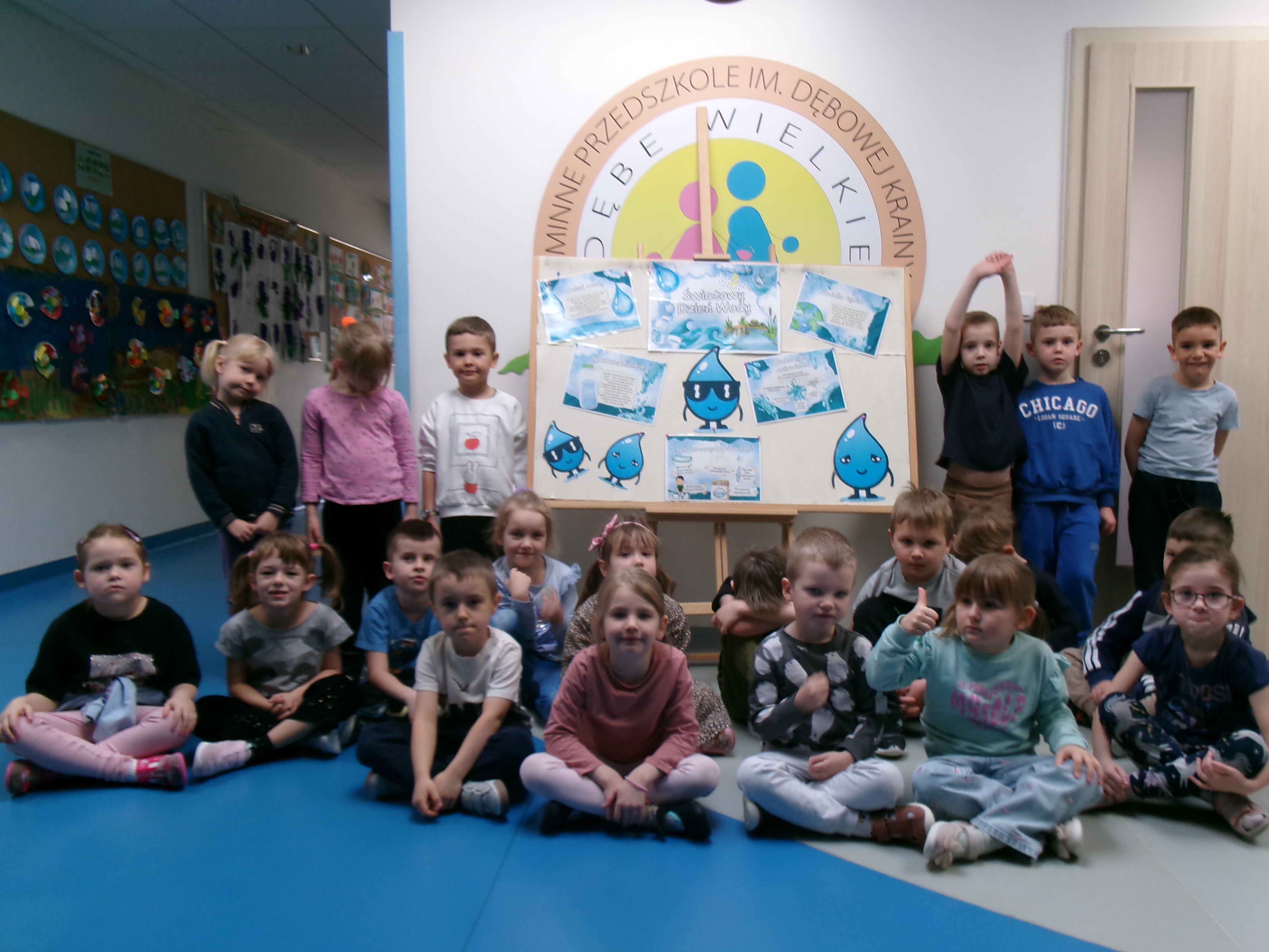 Dnia 23 marca (poniedziałek) rozmawiałyśmy z dziećmi na temat roli wody w naszym życiu codziennym. Tego dnia poprzez różnorodne działania dzieci dowiedziały się wielu informacji i ciekawostek o wodzie m.in.: jak wygląda obieg wody w przyrodzie, ile procent powierzchni Ziemi zajmuje woda i ile jej mamy w organizmie, w jaki sposób, poprzez codzienne czynności, oszczędzać wodę. Badały i poznawały jej różne właściwości: smak, zapach, kolor.