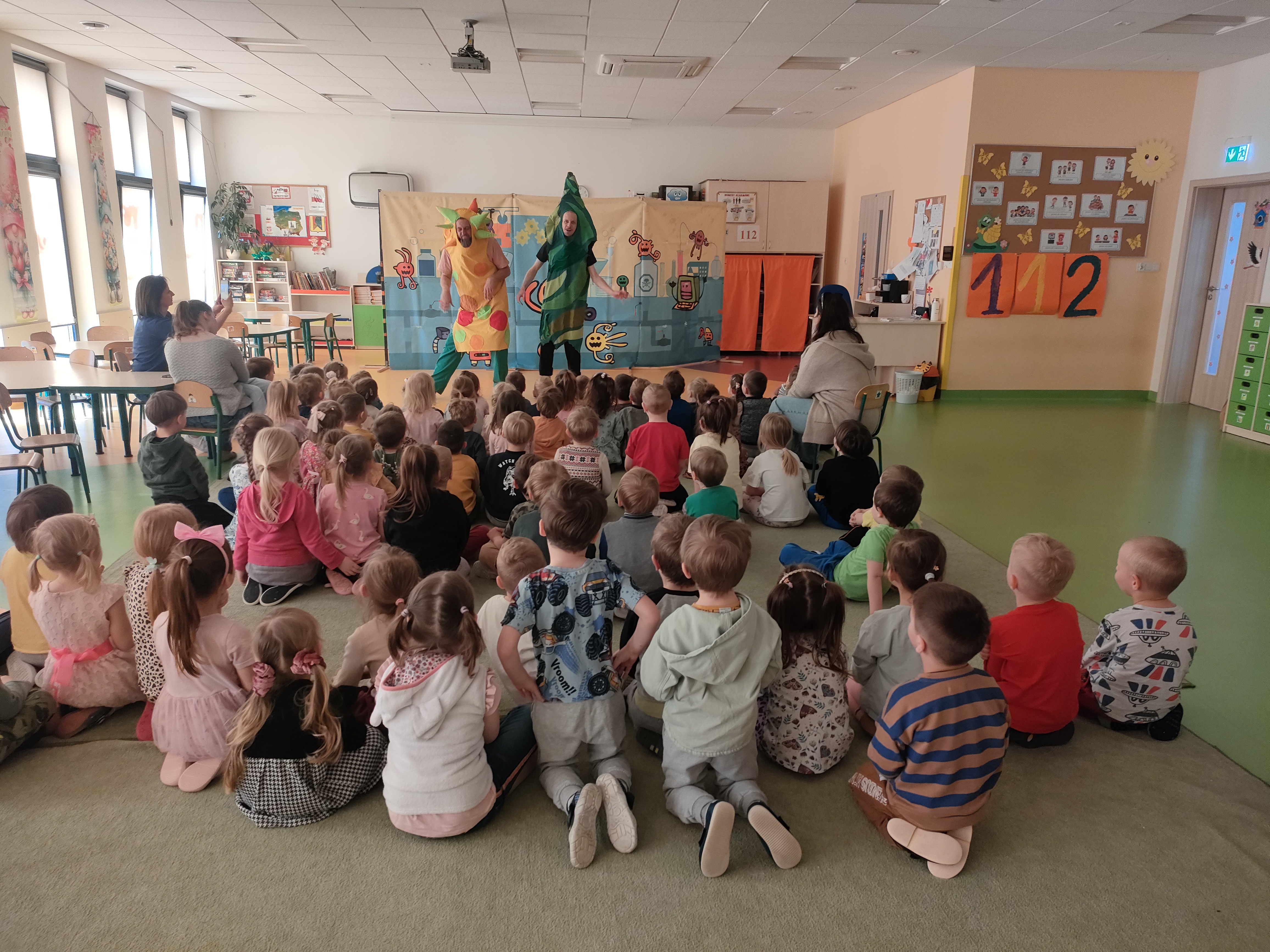 Dnia 25 marca dzieci ze wszystkich grup przedszkolnych obejrzały teatrzyk pt. „Profesorek Wodorek i jego superbohaterowie”. Aktorzy doskonale wcielili się w swoje role i potrafili rozbawić, a jednocześnie zaciekawić publiczność. Przedszkolaki dowiedziały się czym są bakterie, gdzie mieszkają, jakie wywołują nieprzyjemne dolegliwości w naszym ciele oraz jak można się ich skutecznie pozbyć. Profesorkowi Wodorkowi w jego opowieści towarzyszyli superbohaterowie i okazało się, że byli nimi mydło, szczoteczka do zębów, płuca oraz czapka i szalik. Dzieci od tej pory będą pamiętać jak ważne jest dbanie o higienę oraz dokładne mycie całego ciała, a szczególnie rąk oraz dostosowanie ubioru do pogody panującej na zewnątrz.
