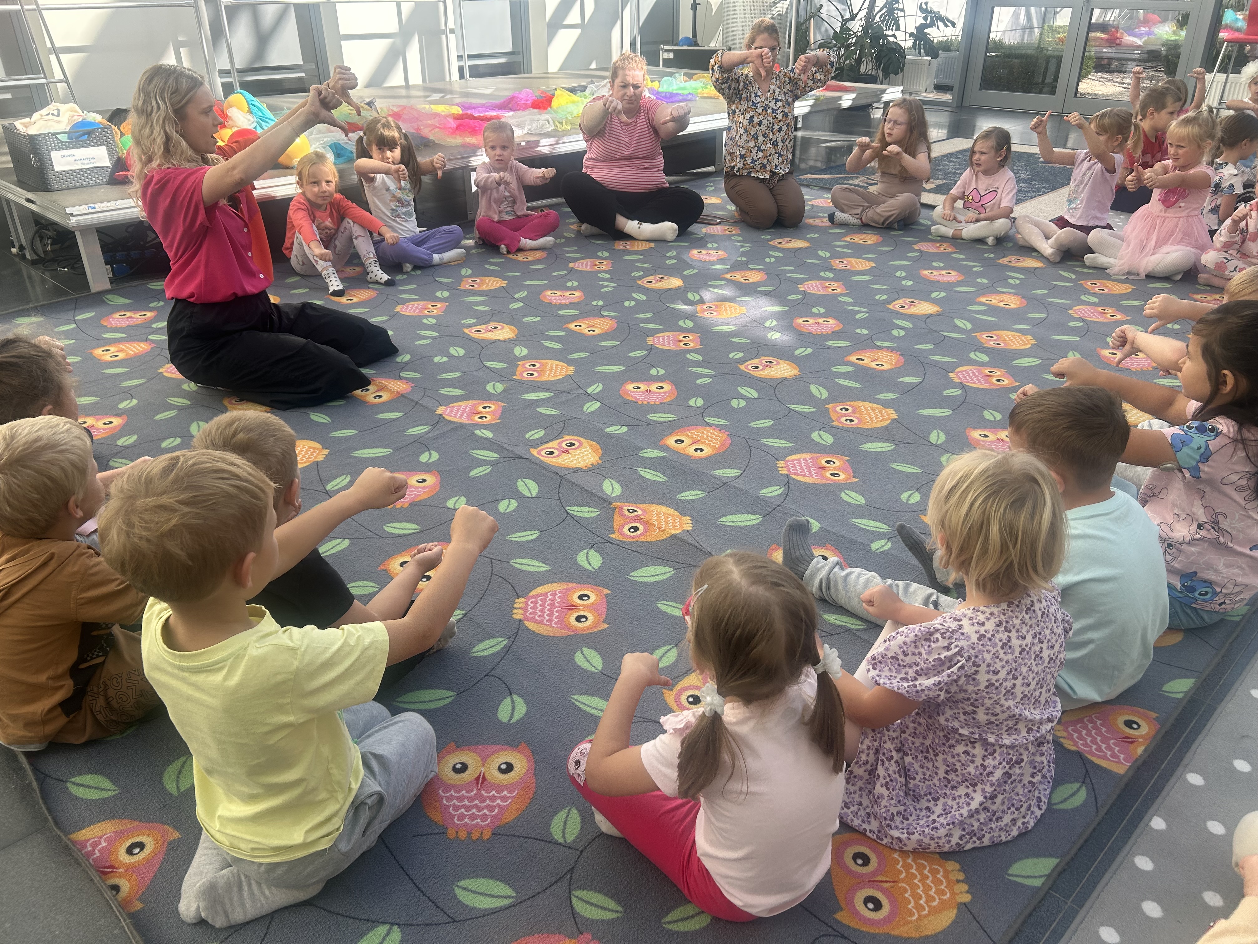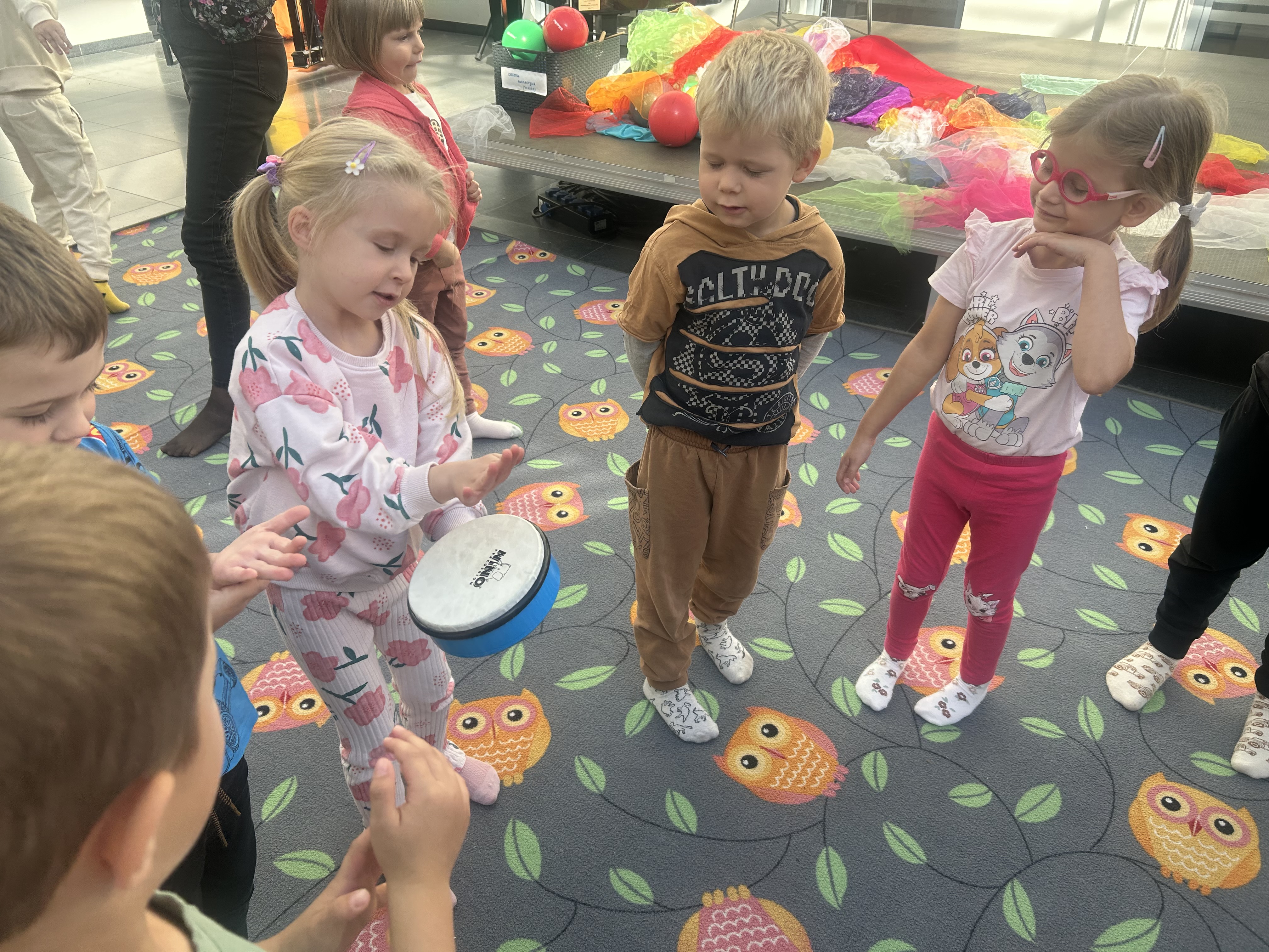 25 września najstarsze grupy z naszego przedszkola, tj. „Skrzaty”, „Sówki” i „Wiewiórki” wybrały się do kina „Muza” na warsztaty pt. „Kasztany i liście” – zabawy muzyczne porządkujące przestrzeń. Na zajęciach dzieci z zaangażowaniem poprzez ekspresję ruchową, taniec, śpiew i grę na instrumencie (bębenku) rozwijały wrażliwość muzyczną, kreatywność oraz koordynację ruchową. Był to dzień pełen dźwięków, zabawy i twórczych wyzwań.